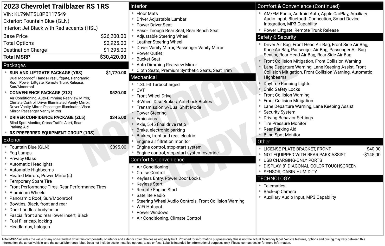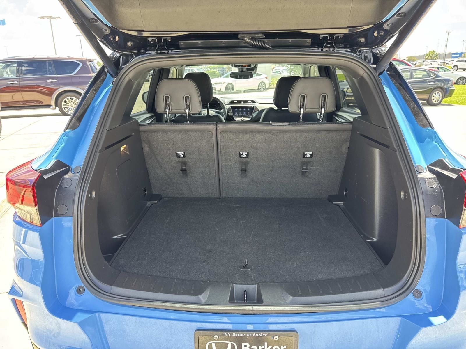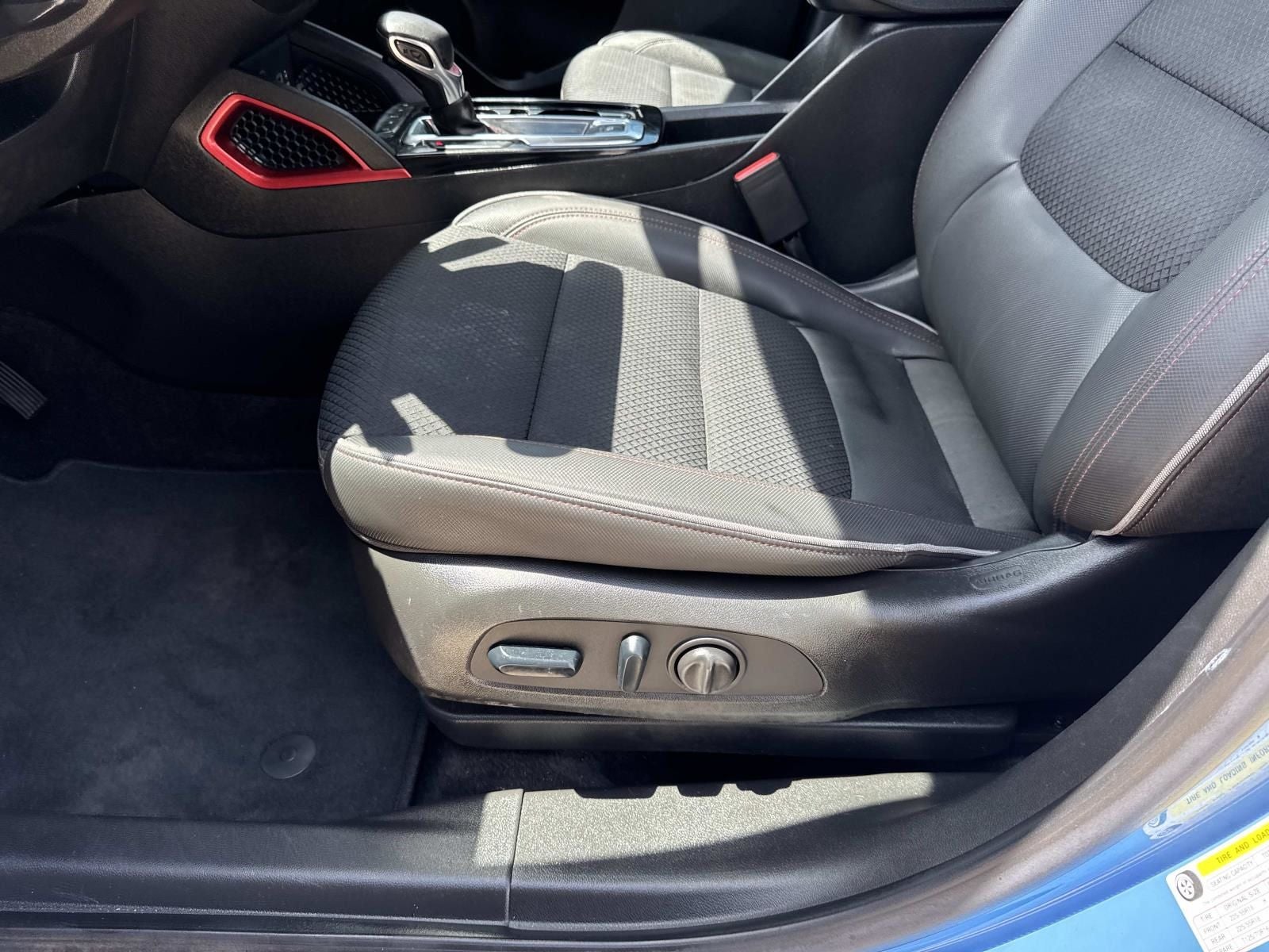 1 Type-A & 1 Type-C USB Charging-Only Ports, 120-Volt Power Outlet, 2-Way Adjustable Front Head Restraints, 2-Way Power Driver Lumbar Seat Adjuster, 4-Way Manual Front Passenger Seat Adjuster, 6 Speakers, 6-Speaker Audio System Feature, 7 Diagonal Color Touchscreen, 8-Way Power Driver Seat Adjuster, 8 Diagonal Color Touchscreen Display, Air Conditioning, Auto High-beam Headlights, Brake assist, Bumpers: body-color, Cabin Humidity Sensor, Cloth w/Leatherette Seat Trim, Convenience Package, Delay-off headlights, Driver & Front Passenger Illuminated Vanity Mirrors, Driver Confidence Package, Dual-Pane Panoramic Power Sunroof, Electronic Stability Control, Exterior Parking Camera Rear, Flat-Folding Front Passenger Seatback, Front Bucket Seats, Front Center Armrest, Front fog lights, Front License Plate Bracket, Front reading lights, Fully automatic headlights, Hands-Free Power Programmable Liftgate, Heated door mirrors, Heated Driver & Front Passenger Seats, Heated front seats, Heated Steering Wheel, Heated steering wheel, Illuminated entry, Inside Rear-View Auto-Dimming Mirror, Lane Change Alert w/Side Blind Zone Alert, Leather Shift Knob, Leather steering wheel, Mosaic Black Metallic Two-Tone Roof, Not Equipped w/Rear Park Assist (060), Overhead console, Panic alarm, Passenger vanity mirror, Power door mirrors, Power driver seat, Power steering, Power windows, Preferred Equipment Group 1RS, Radio data system, Radio: Chevrolet Infotainment 3 System, Rear Cross Traffic Alert, Rear Park Assist, Rear window defroster, Rear window wiper, Remote keyless entry, Security system, Single-Zone Auto Climate Control Air Conditioning, SiriusXM Radio, Speed control, Split folding rear seat, Spoiler, Sun & Liftgate Package, Variably intermittent wipers, Wheels: 18 High Gloss Black Machined Aluminum, Wireless Apple CarPlay/Android Auto.